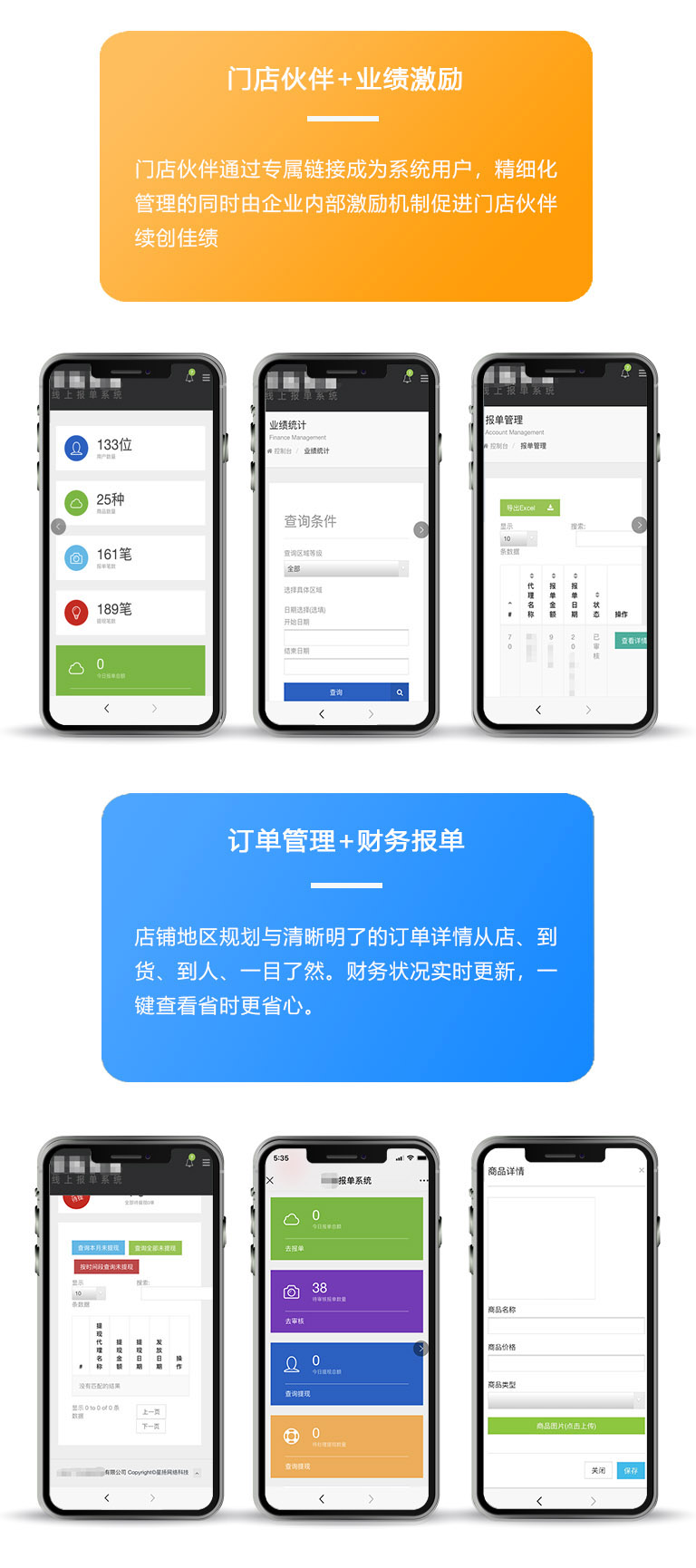 云平台报单管理财务系统从企业个性化经营的角度出发,从经营合作伙伴管理,客户订单管理到产品品类管理进行统一信息化管理。